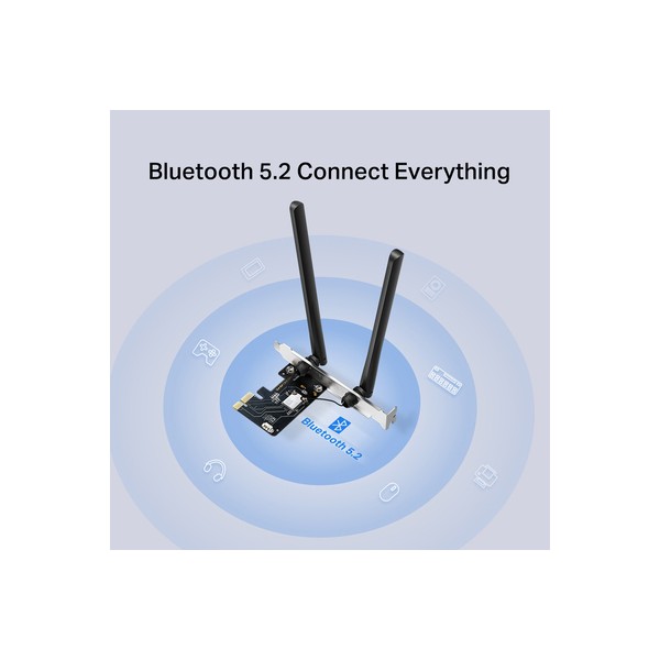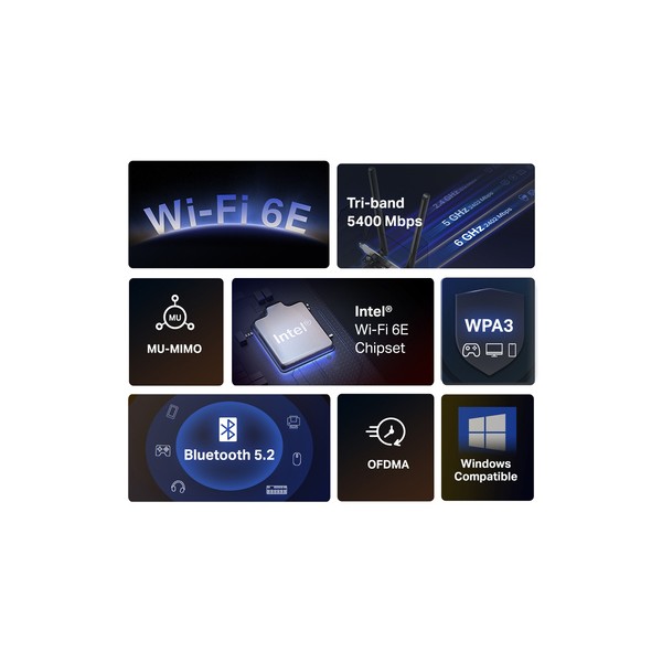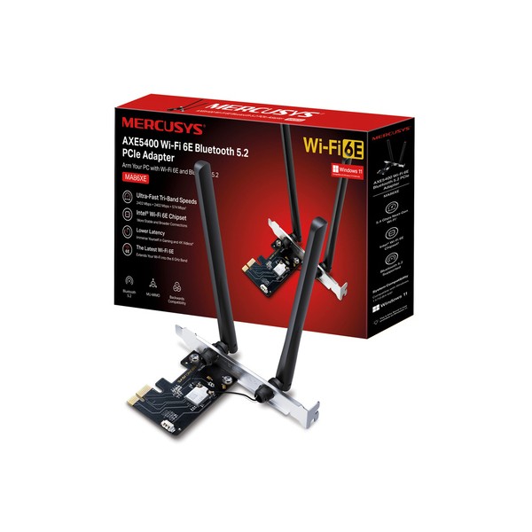 Η κάρτα δικτύου MA86XE της Mercusys συνδέεται στον υπολογιστή σας μέσω PCIe υποδοχής δίνοντας σας την δυνατότητα να συνδεθείτε ασύρματα στο δίκτυο με γρήγορες ταχύτητες Wi-Fi 6E έως 5.4Gbps. Επιπλέον, προσφέρει στον υπολογιστή σας τεχνολογία Bluetooth 5.2, που σας επιτρέπει να συνδέσετε ασύρματα στον υπολογιστή, συσκευές Bluetooth, όπως ποντίκια και πληκτρολόγια.
