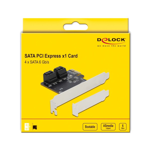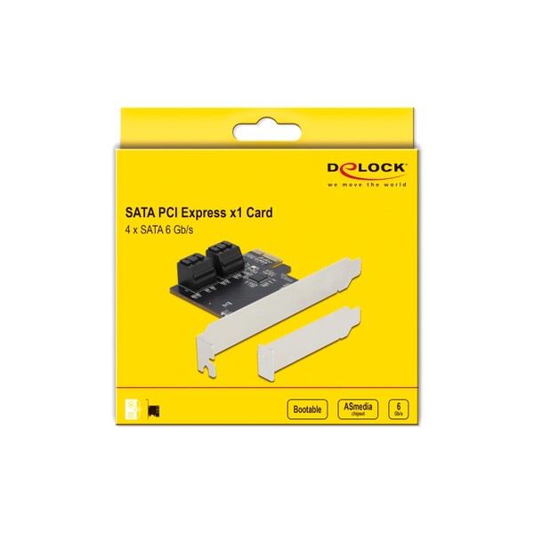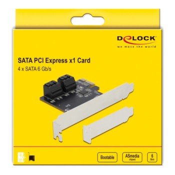 Η κάρτα επέκτασης PCI από τη Delock επεκτείνει το desktop με 4 εσωτερικές θύρες SATA. Διαφορετικές συσκευές όπως δίσκοι SSD, σκληροί δίσκοι, δίσκοι DVD κ.λπ. μπορούν να συνδεθούν στην κάρτα.