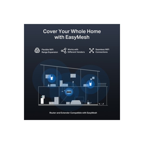 Λειτουργεί με EasyMesh routers και extenders για να σχηματίσει ένα ευέλικτο οικιακό Mesh WiFi δίκτυο, που παρέχει απρόσκοπτη κάλυψη σε όλο το σπίτι.