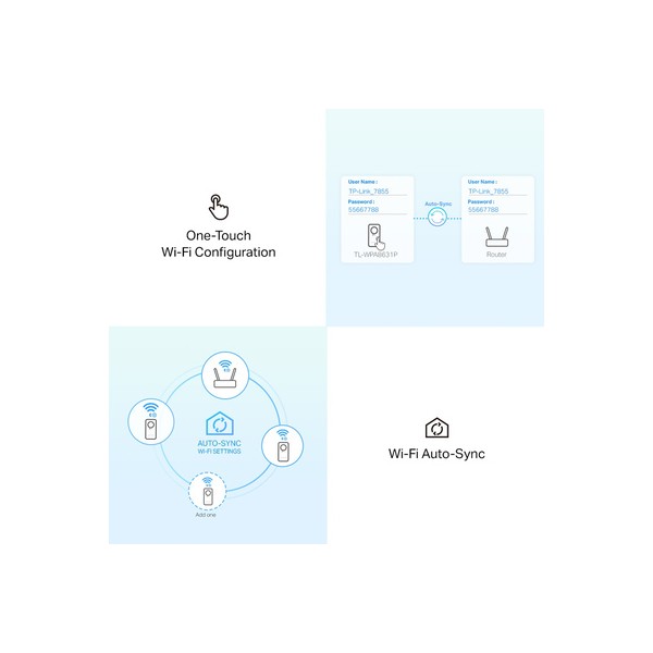 -Διαμόρφωση Wi-Fi με ένα πάτημα: Ένα πάτημα του κουμπιού Wi-Fi αντιγράφει το όνομα και τον κωδικό πρόσβασης δικτύου από το router σας. Τυχόν αλλαγές στις ρυθμίσεις θα εφαρμοστούν αυτόματα σε ολόκληρο το δίκτυο Powerline
