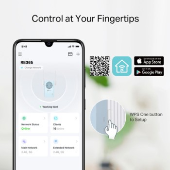 Έχετε κουραστεί από νεκρές ζώνες WiFi στο σπίτι σας; Το RE365 Range Extender συνδέεται ασύρματα με το router WiFi, ενισχύοντας και επεκτείνοντας το σήμα του έως και 930 τετραγωνικά μέτρα. Με ταχύτητες έως 300Mbps στα 2.4GHz και 867Mbps στα 5GHz, αντικαταστήστε τις νεκρές ζώνες με ισχυρό, γρήγορο WiFi σε κάθε δωμάτιο.
