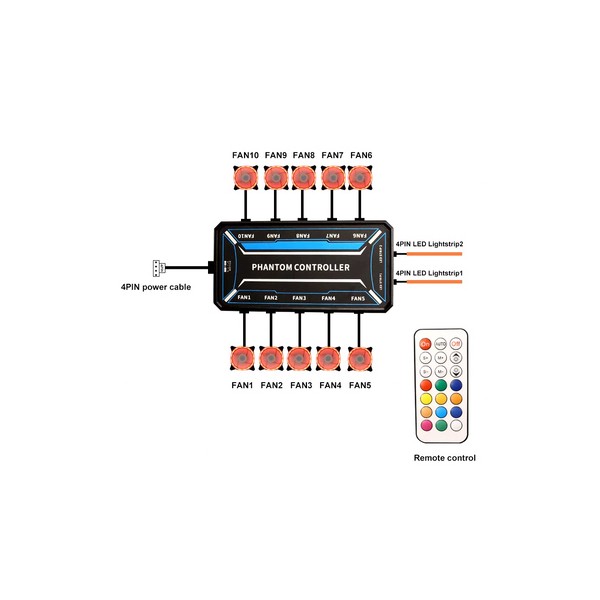 RGB fan controller με ασύρματο χειριστήριο της Powertech. Υποστηρίζει έως 10 LED ανεμιστήρες και έως 2 LED καλωδιοταινίες.