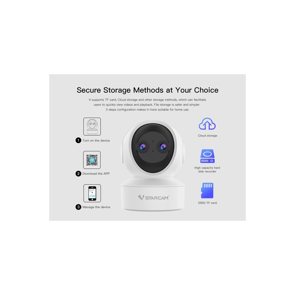 -Storage: Supports TF card (max 256GB), Cloud Storage, NVR, NAS