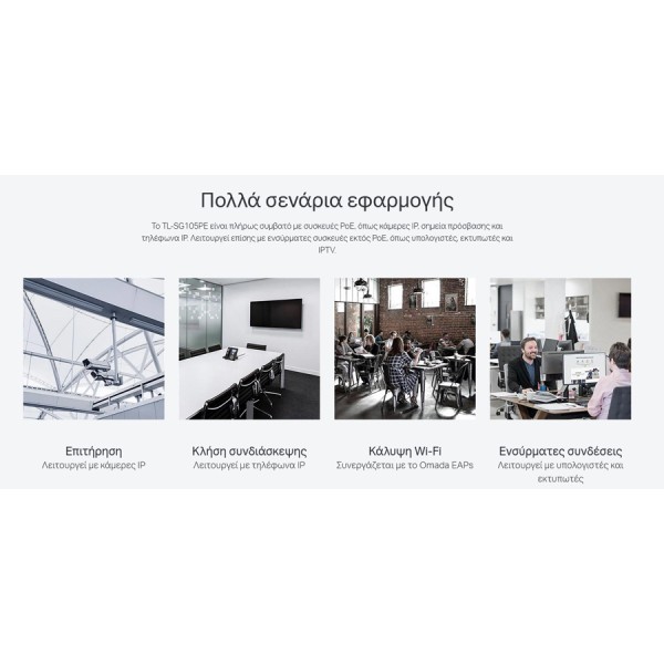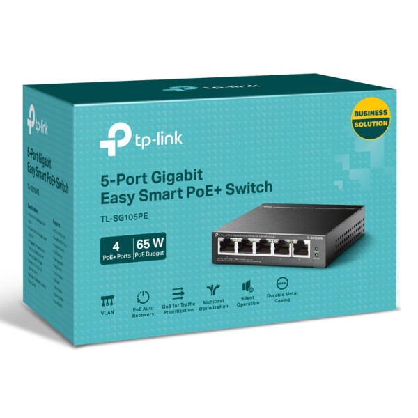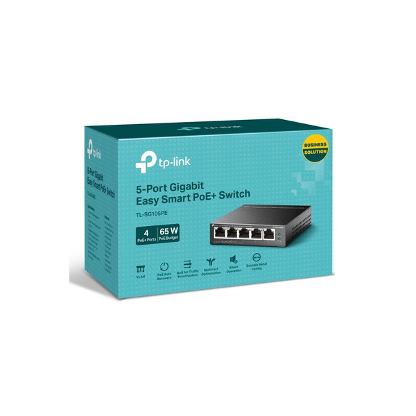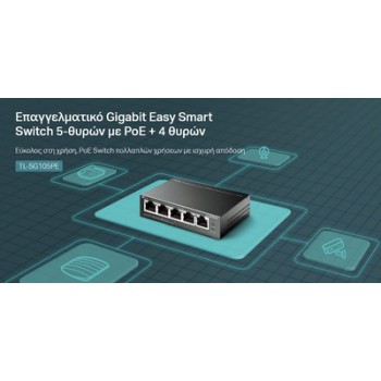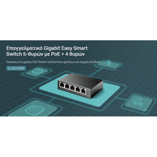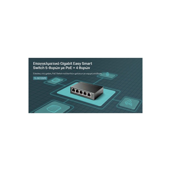 Το TL-SG105PE είναι ένα επαγγελματικό Gigabit Easy Smart Switch 5-θυρών με PoE + 4 θυρών, πλήρως συμβατό με συσκευές PoE, όπως κάμερες IP, σημεία πρόσβασης και τηλέφωνα IP. Λειτουργεί επίσης με ενσύρματες συσκευές εκτός PoE, όπως υπολογιστές, εκτυπωτές και IPTV.