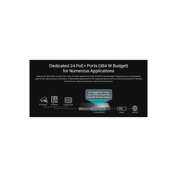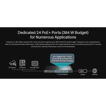 PoE+ Ports(RJ45): Standard: 802.3at/af compliant, PoE+ Ports: 24 Ports, up to 30 W per port, Power Budget: 384 W