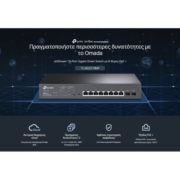 Το TL-SG2210MP είναι ένα switch επαγγελματικών προδιαγραφών που εξοπλίζεται με 8 θύρες δικτύου PoE+ και 2 θύρες SFP με ταχύτητες 10/100/1000Mbps.