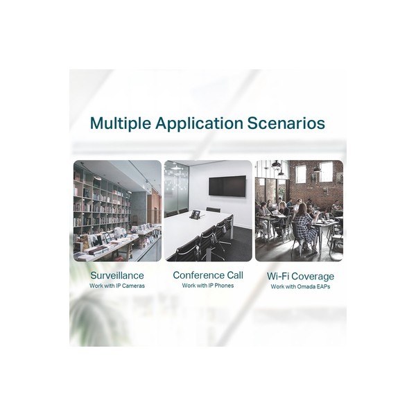Είναι πλήρως συμβατό με συσκευές όπως κάμερες IP, access points τηλέφωνα IP, υπολογιστές, εκτυπωτές και IPTV.