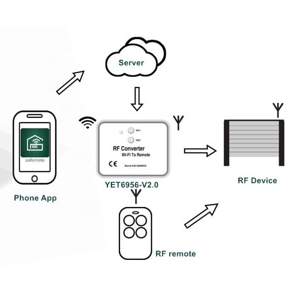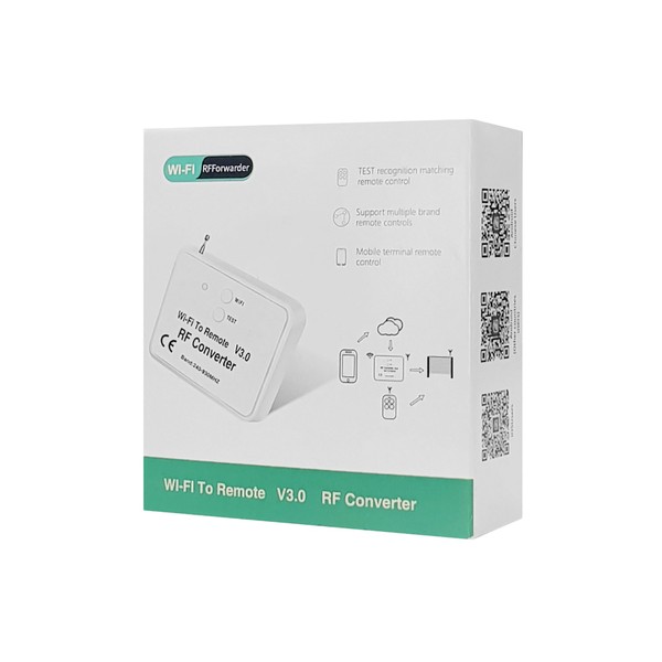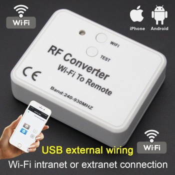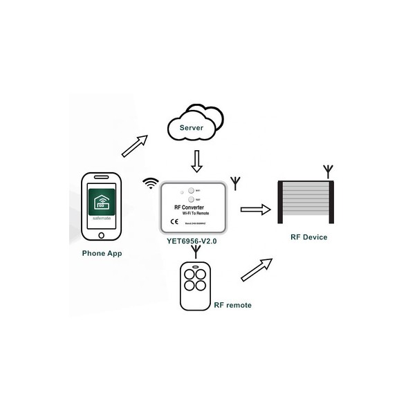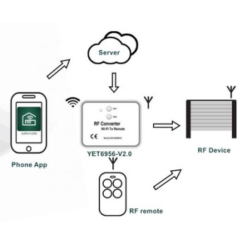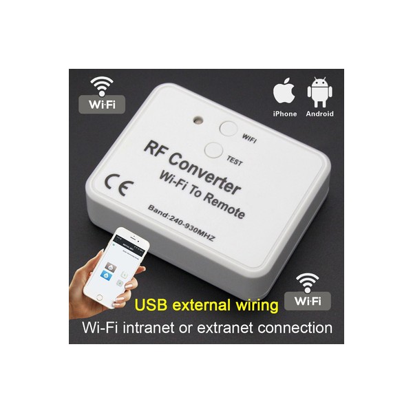 Με τον μετατροπέας wifi σε RF, χωρίς αλλαγή του receiver/controller RF, μπορείτε εύκολα να ρυθμίσετε τη συσκευή RF να ελέγχεται μεσω εφαρμογής WIFI για κινητά (παραδείγματα συσκευών RF: χειριστήρια πόρτας γκαράζ, χειριστήρια πύλης, προϊόντα ασφαλείας, rf έλεγχος φωτός κ.λπ.).
