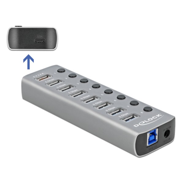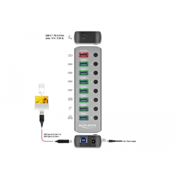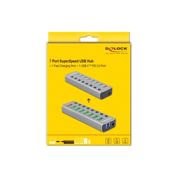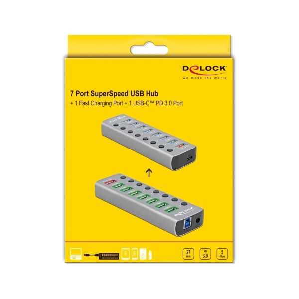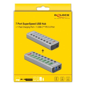 Το Hub USB 3.0 Gen 1 της Delock μπορεί να συνδεθεί με υπολογιστή μέσω καλωδίου USB επεκτείνοντας τον με 7 θύρες USB ενώ διαθέτει και 1 ακόμα θύρα USB ταχείας φόρτισης συσκευών όπως smartphone με απόδοση 2,4A και 1 θύρα USB Type-C PD 3.0 με απόδοση 12V και 2,25A, οπού μπορούν να φορτίσουν ακόμη και τα laptop. Οι συνδεδεμένες συσκευές όπως τα smartphone μπορούν να φορτιστούν ή να μεταφέρουν δεδομένα στα 5 Gbps. Κάθε θύρα μπορεί να ενεργοποιηθεί ή να απενεργοποιηθεί ξεχωριστά χρησιμοποιώντας τους διακόπτες. Είναι ένα κομψό προϊόν υψηλής ποιότητας το οποίο είναι κατασκευασμένο από αλουμίνιο. Το design και η αίσθηση του μεταλλικού υλικού της κατασκευής δίνει ιδιαίτερο τόνο στο γραφείο σας, ταιριάζοντας αρμονικά με τις υπόλοιπες συσκευές σας.