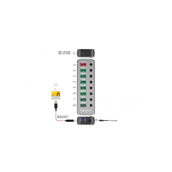 DELOCK USB hub 63264 με διακόπτες, 9x θυρών, 5Gbps, 12V/2.25A PD, γκρι