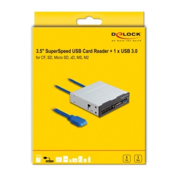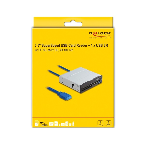 Αυτό το card reader της Delock συνδέεται εσωτερικά στην μητρική κάρτα του PC σας σε μια ελεύθερη θύρα USB 19 pin και μπορεί να τοποθετηθεί σε ένα ελεύθερο 3.5" bay του case σας. Διαθέτει έξι διαφορετικές υποδοχές ανάγνωσης καρτών και μια υποδοχή USB.
