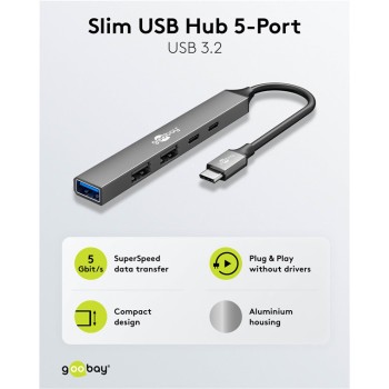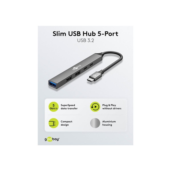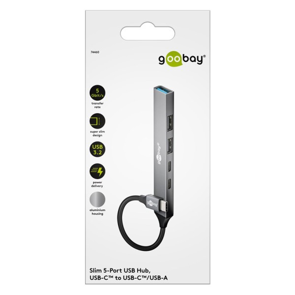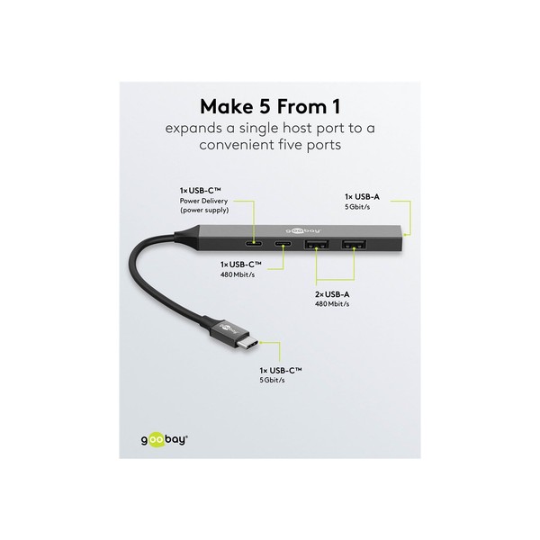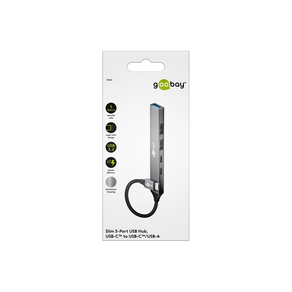 GOOBAY USB hub 74460, 5x θυρών, USB 3.2, 5Gbps, 100W, USB-C σύνδεση, γκρι