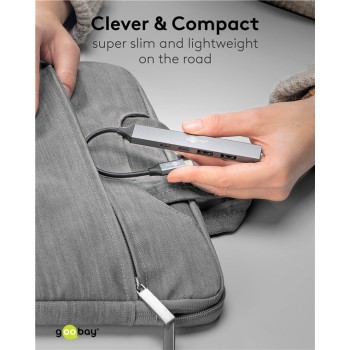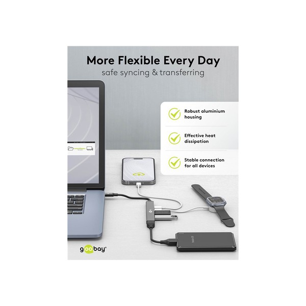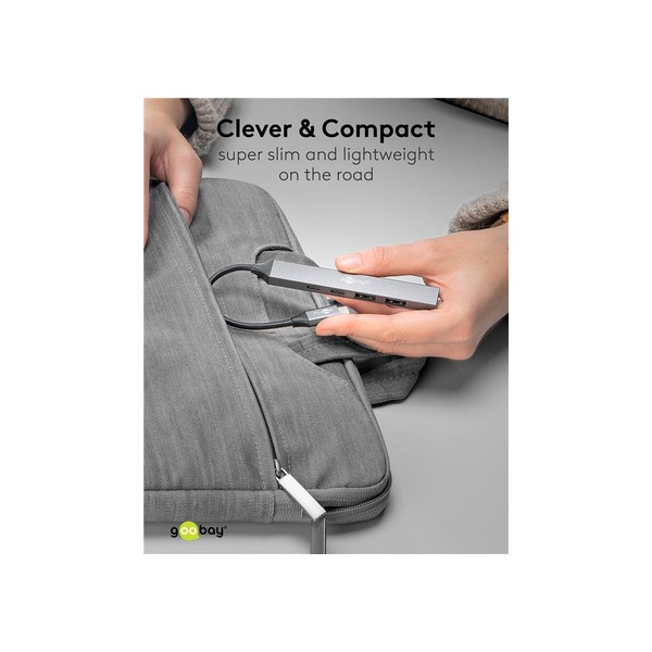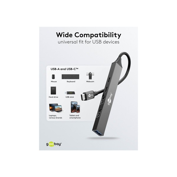 Αυτό το hub της Goobay μπορεί να συνδεθεί με το laptop σας μέσω θύρας USB-C και να επεκτείνει τις θύρες του με 2x USB-C (μια εκ των οποίων για τροφοδοσία) και 3x USB θύρες. Διαφορετικές συσκευές USB, όπως εξωτερικοί σκληροί δίσκοι, card readers, ποντίκια κλπ. μπορούν να συνδεθούν μέσω του hub. Μέσω της θύρας USB-C PD (τροφοδοσίας) μπορείτε να φορτίσετε το laptop σας με απόδοση έως 100W.