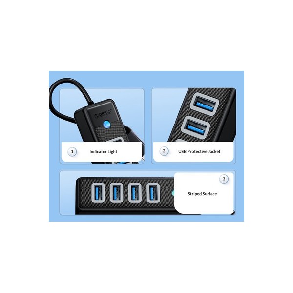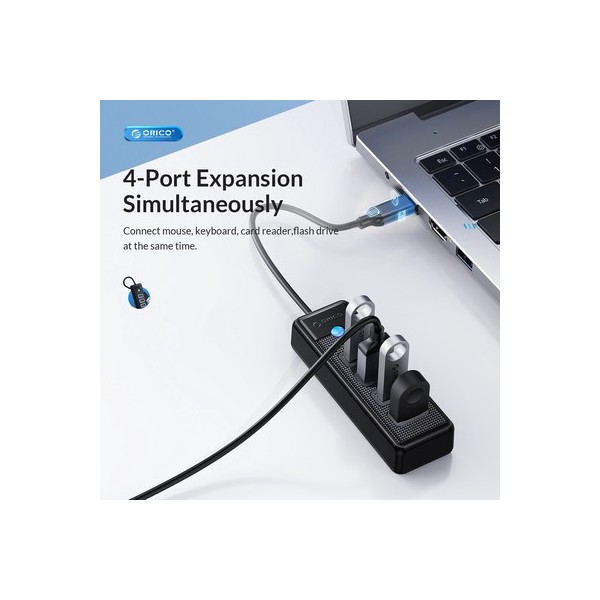 Αυτό το hub της ORICO μπορεί να συνδεθεί με το laptop ή το desktop σας μέσω θύρας USB-C και να επεκτείνει τις θύρες του με 4x USB θύρες. Διαφορετικές συσκευές USB, όπως εξωτερικοί σκληροί δίσκοι, card readers, ποντίκια κλπ. μπορούν να συνδεθούν μέσω του hub.