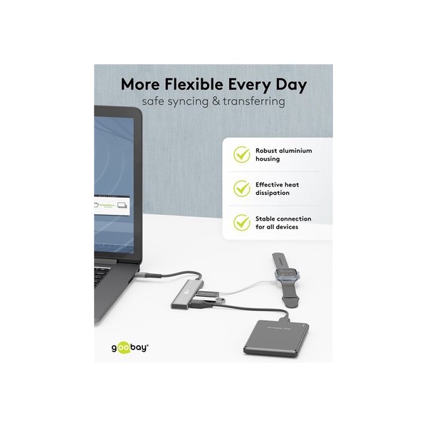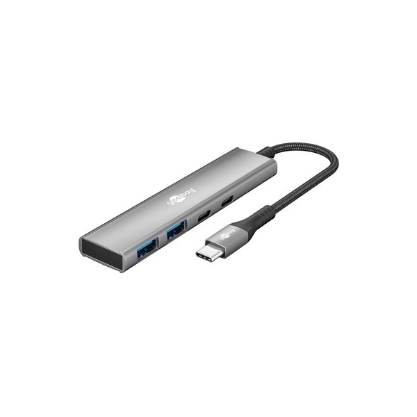 Αυτό το hub της Goobay μπορεί να συνδεθεί με το laptop ή το desktop σας μέσω θύρας USB-C και να επεκτείνει τις θύρες του με 2x USB και 2x USB-C θύρες. Διαφορετικές συσκευές USB, όπως εξωτερικοί σκληροί δίσκοι, card readers, ποντίκια κλπ. μπορούν να συνδεθούν μέσω του hub.